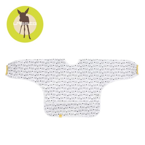 Великий нагрудник світлого кольору, з довгими рукавами і з мотивом привітної мордки кота.