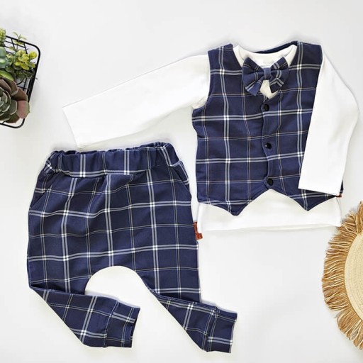Елегантний і зручний одяг для хлопчиків в унікальну темно-синю клітинку з додаванням бежевого, білого і блакитного.Це красиво виглядає і дуже комфортно для дітей, не сковує їх рухів і не обмежує активності.Унікальне поєднання кольорів і аксесуари роблять його ідеальним нарядом для хрещення, дня народження та інших важливих свят для кожного хлопчика.