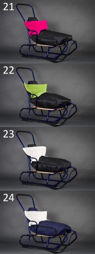 До санок йде спинка, яка прикручується на гвинти, які є в комплекті, штовхач (знімний) і спальний мішок.