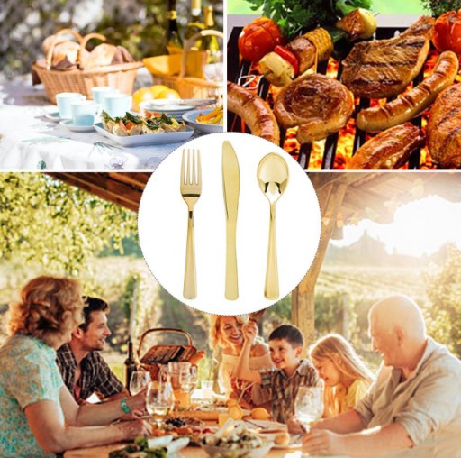 Набір столових приборів в унікальному та оригінальному кольорі METALIC GOLD. Ідеально підходить для будь-якої вечірки, як на вулиці, так і в приміщенні. Цей продукт є абсолютним ХІТОМ, перевершуючи всі класичні одноразові прикраси на голову.