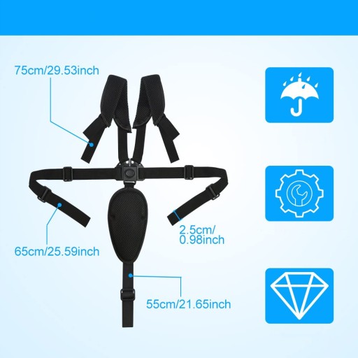 П'ятиточкова конструкціяРемінь безпеки дитини розташований на 5 точок вище плечей і стегон і кріпиться до пряжки між ніг. Він підійшов до тазу, плечей і грудей. У разі аварії, коли дитина рухається вперед у сидінні, ремінь безпеки може обернути дитину та негайно зупинити рух дитини, щоб забезпечити безпеку дитини.Вільно регулюється довжина.Довжину ременя безпеки можна вільно регулювати, розмір лямки приблизно 75 см, обхват талії приблизно 65 см, обхват промежини приблизно 65 см. 55 см і ширина всіх лямок 2,5 см. Потовщений матеріал Дитячий ремінь безпеки виготовлений з якісного поліпропіленового матеріалу з відмінною прошивкою і жорсткою пряжкою, стійкий до розривів і пошкоджень, дуже довговічний, міцний і міцний. Простий у використанні 5- Точковий ремінь легкий і складається, його можна брати з собою в подорож. Він підходить для повсякденного використання та подорожей, тому ви можете брати його з собою, не займаючи зайвого місця Перший вибір для ременів безпеки для крісел Сидіння для годування легко надягати та знімати, а в перфорованому вигляді є не потрібно витрачати час на проколювання пряжки. Дитячі ремені безпеки більше підходять для повсякденного використання і підходять до більшості типів колясок, автокрісел і високих стільчиків.