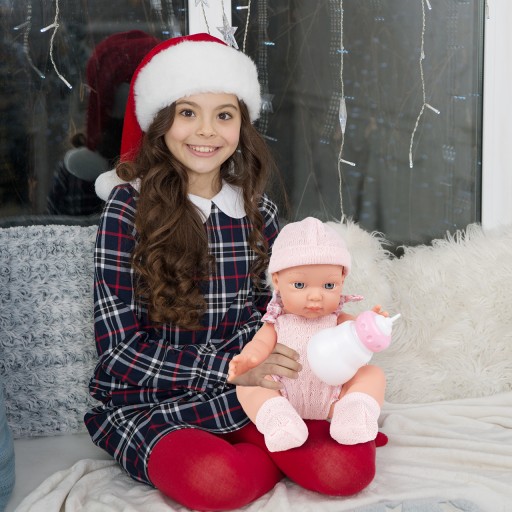Милий пупс для одягання та догляду. У барвистому вбранні, з двома шапочками, пляшечкою, пелюшкою та брязкальцем. Велика лялька, висотою до 30 см, стане чудовим подарунком для маленької дівчинки. Лялька допоможе навчитися доглядати за дітьми, ідеально імітуючи малюка. У набір входять дві шапочки, в які ми можемо одягнути малюка. З ляльки можна зняти весь наряд.
