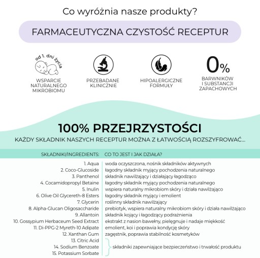 Аква, коко-глюкозид, пантенол, кокамідопропілбетаїн, інулін, ефіри гліцерет-8 оливкової олії, гліцерин, олігосахарид альфа-глюкан, алантоїн, екстракт насіння Gossypium Herbaceum, ді-PPG-2 мірет-10 адипат, ксантанова камедь, лимонна кислота, Бензоат натрію, сорбат калію