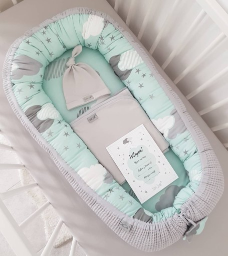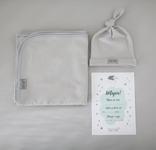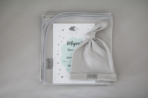 Набір для новонародженого з 3 предметів: пелена, шапочка та свідоцтво про народження.