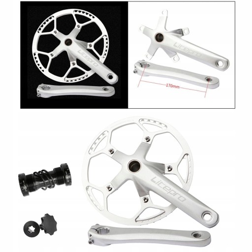 : Кривошипно-шатунний механізм для складного велосипеда: каретка BB Ширина: 68-73 мм BCD: 130 мм Довжина шасі: 170 мм Зуби: 53T, 56T, 58T Виготовлений з високоякісного алюмінієвого матеріалу - високоміцний, міцний, але надлегкий і надійний Довжина 170 мм без застосування системи ланцюгових коліс і болтів Сумісність із п’ятьма зубцями шириною 68-73 мм, нижній кронштейн ланцюжка M68 і шпиндель M18 24 мм. Підходить для одношвидкісних складних велосипедів