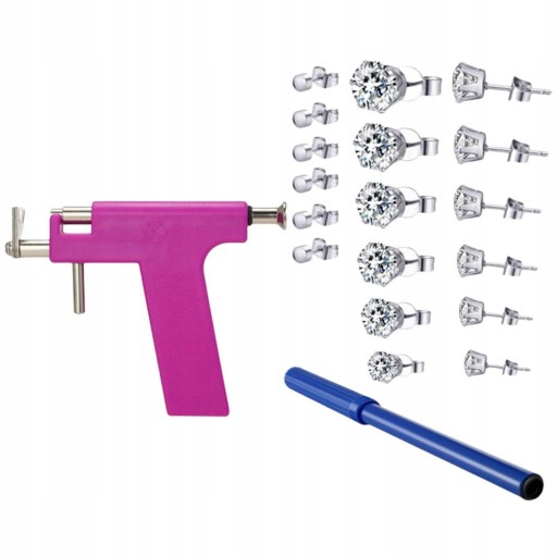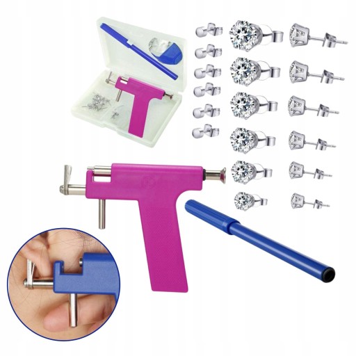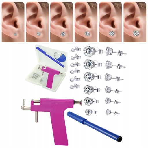 У комплект входить 1шт пістолет для пірсингу, 1шт маркер, 1шт пластикова коробка, 1шт дзеркало, 12 пар вушних шпильок (6 пар сережок з нержавіючої сталі, 6 пар сережок з нержавіючої сталі з фіанітами, включаючи 3 мм, 4 мм, 5 мм, 6 мм, 7 мм і 8 мм)