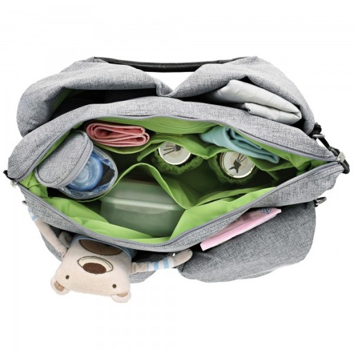 - безліч внутрішніх кишень, в тому числі: велика, на блискавці, водонепроникна, куди можна сміливо помістити заплямовану футболку або лінійку, і менша на липучці для змінного одягу або улюбленої ковдри; два менших відділення, оброблених гумкою, ідеально підходять для баночок з десертом або обідом, додатково посилені та знімні, оскільки кріпляться зсередини на застібки; відкрита кишеня для зручного, складного пеленального килимка, прикріпленого до сумки, кольору сумки; і кишеню з віконцем, ідеально підходить для вологих серветок, тому що ви можете дістати їх, не виймаючи всю упаковку;
