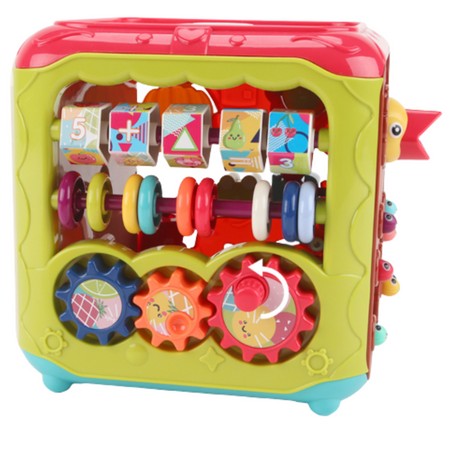 Куб оснащений багатьма різними елементами, які привертають увагу дитини та стимулюють її почуття. Завдяки вбудованим звукам малюк може вивчати різні звуки і вчитися розпізнавати звуки.