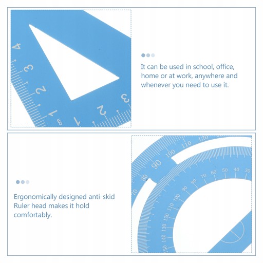 Практичний набір геометрії лінійки міцний, лінійка не згинається і не згинається під час використання, а головку лінійки з ергономічним дизайном зручно тримати. Універсальна ручка Лінійка працює з будь-яким олівцем або ручкою стандартного розміру. Крім того, лінійки, трикутники та коліметри розділені для легкої ідентифікації. Завдяки міцному відділенню для зберігання його легко переносити та зберігати.