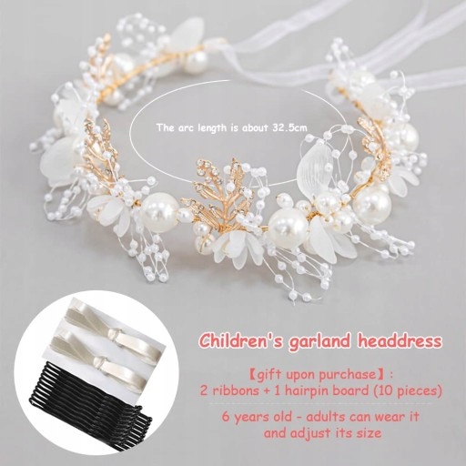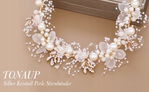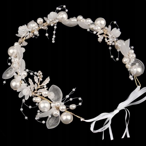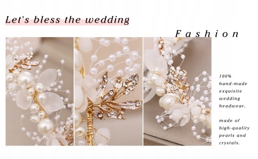 Весільні аксесуари для волосся для нареченої складаються з штучних перлів і штучних квітів. Золотий сплав витканий і загорнутий. Завдяки цьому гумка для волосся має м'які властивості. Його можна підігнати під задану форму.