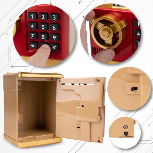Безпека ваших заощаджень - це найголовніше! Тому скарбничка у формі сейфа оснащена електронною системою - щоб відкрити двері, потрібно ввести відповідний 4-значний код доступу! Щоб змінити код на сейф, введіть попередній код (за замовчуванням 0000), а потім відкрийте двері. Потім натисніть і утримуйте кнопку із символом зірочки протягом усієї процедури. Коли червоне світло почне блимати, необхідно ввести новий код. Після введення коду натисніть кнопку з галочкою. На цьому етапі новий код має працювати.