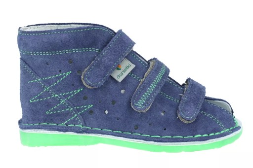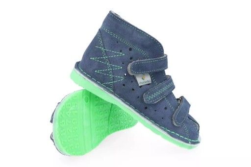 Профілактичне взуття Chopice Danielki TA105 джинсового кольору з зеленою підошвою та швами рекомендовано всім дітям. Шкіряна устілка профільована, а жорсткий каблук не дає стопі вислизнути всередину або назовні.