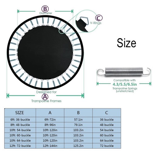 Високоякісні змінні батутні килимки з поліпропіленового матеріалу та міцної прошивки, високоміцні V-подібні кільця для безпечної заміни, стійкий, водонепроникний та стійкий до вицвітання килимок для тривалого використання Міцні пружини забезпечують відмінну несучу здатність і чудову гнучкість Пропонуються три розміри (розмір рами, розмір килимків, розмір пружини) для зручного вибору розміру
