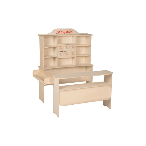 - Магазин з деревини натурального кольору, розміри (висота х ширина х г) 120,5 х 107 х 95 см, висота стійки 58 см. Всі матеріали перевірені на вміст шкідливих речовин відповідно до стандарту іграшок EN 71-1:2014