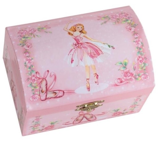 Дівчата люблять скриньки, в яких можна зберігати різні дрібнички та прикраси. Остання коробка від бренду Goki - це коробка з щільного армованого картону, бічні стінки якої рожеві та нанесені красивими квітами та танцювальними туфлями. На кришці коробки можна побачити зображення великої балерини, яка танцює в біло-рожевій сукні, тримаючи в руці квітку. Внутрішня частина коробки обшита світло-рожевим оксамитовим матеріалом; Відкривши коробку, ми також бачимо маленьку фігурку балерини, яка обертається в ритмі мелодії Лебединого озера - музична скринька працює після заводу механізму і не вимагає використання батарейок.