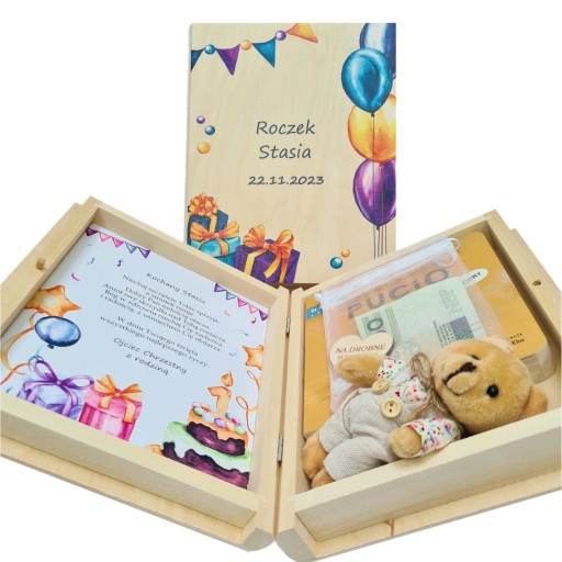 - повністю персоналізована коробка для однорічної дитини у формі книжки, розміри 21,5 см x 17,5 см x 4,5 см