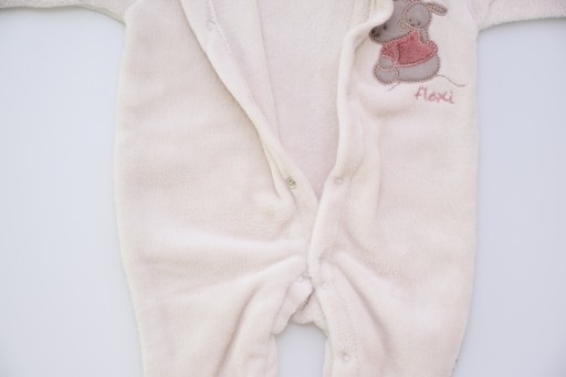 Бежевий флісовий комбінезон застібається на кнопки. Довгий рукав. На лицьовій стороні декоративна аплікація у вигляді ведмедика з кроликом і вишитим написом. Теплий і приємний комбінезон ідеальний для холодних днів.