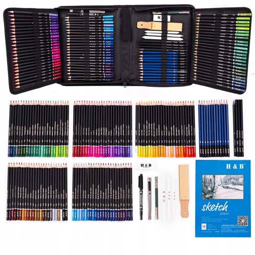 Повний професійний набір для малювання, малювання та розфарбовування. Він містить цілих 145 елементів, включаючи величезну палітру з 120 кольорових олівців, графітних і вугільних олівців. Додатково до набору входять численні аксесуари, такі як: двосторонній маркер, палітурний ніж, ластик, подвійний подовжувач олівців, точилка, шліфувальна машина 3x, наждачний папір, альбом для малюнків А5 та стильний футляр.