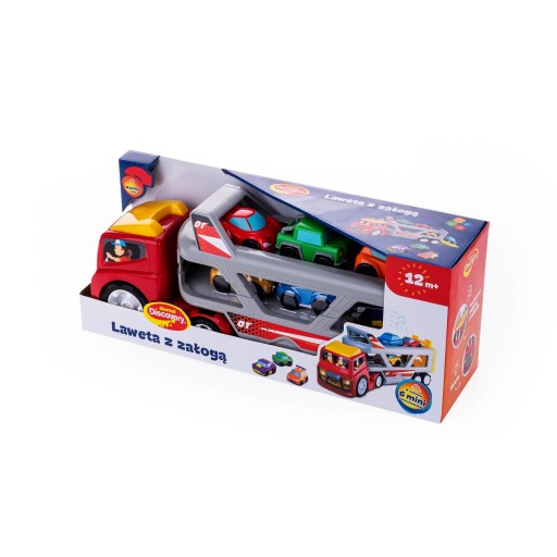 У набір входить великий евакуатор з підсвічуванням, звуками і мелодіями і 6 маленьких машинок, які ідеально розміщуються на двох рівнях евакуатора. Кожен автомобіль має різну форму та колір, тож ви можете легко відрізнити їх. Евакуатор оснащений пандусом із заниженим під'їздом, що полегшує посадку автомобілів і місце на одному з рівнів.