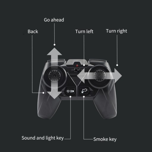 Функції: вперед, назад, поворот ліворуч, поворот праворуч, звукові ефекти диму, 2,4 ГГц, 6 каналів.