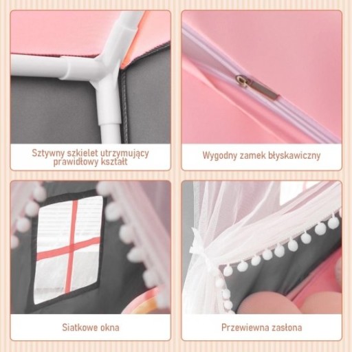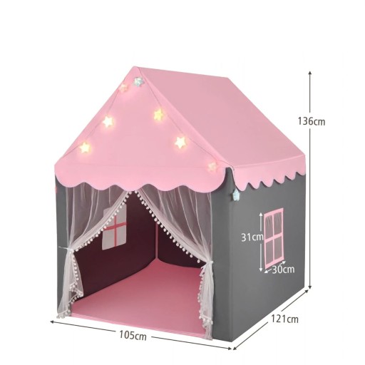 Кожна дитина мріє про своє особливе місце, яке буде його схованкою. Наш дім – це місце, яке забезпечує особистий простір, відпочинок і веселощі. Чарівний будиночок дозволить вашій дитині грати наодинці, з друзями чи батьками. Наш виріб виготовляється з міцних і довговічних ПВХ труб і м'яких тканин. Чохол із суміші поліестеру та бавовни дихаючий і м’який на дотик, а також водонепроникний, а бавовняний килимок захищає від холоду. Виріб можна використовувати вдома і на природі, а завдяки невеликій вазі ви легко зможете взяти його з собою в парк або на дитячий майданчик. У набір входить низка різнокольорових лампочок у формі зірок.