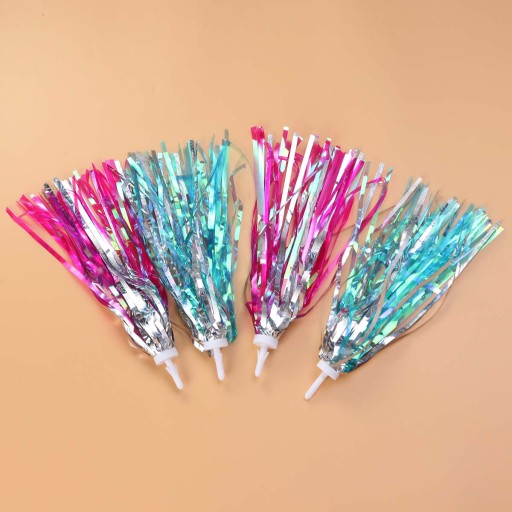 Це набір декоративних стрічок з бахромою для ваших дітей. Ці ручки з бахромою виготовлені з ПВХ пластику. Стрімерні бахроми підходять для більшості велосипедів, триколісних і двоколісних транспортних засобів. Пружинні фіксатори стрічки легко знімаються з керма через отвір в фіксаторі керма.