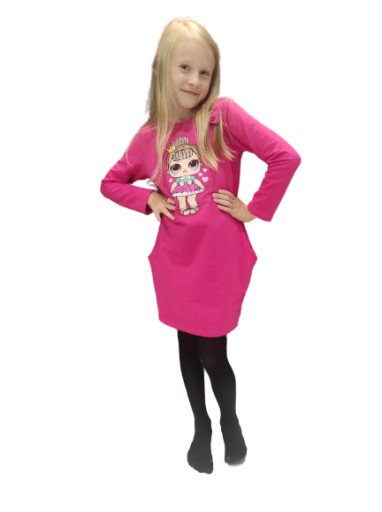 Сукня оброблена дуже ретельно, з увагою до кожної деталі. Матеріал м'який на дотик і першої якості. Дуже зручна туніка-труба, з кишенями, застібається на блискавку. Прикрашена бантом спереду, красивий принт ляльки LOL.