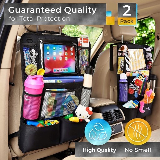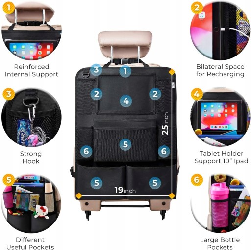 - Безліч кишень. Органайзер для автомобіля на задньому сидінні має 9 відділень різного розміру, включаючи прозорий тримач для планшета, кишені для пляшок і великі сітчасті кишені для інших необхідних речей.