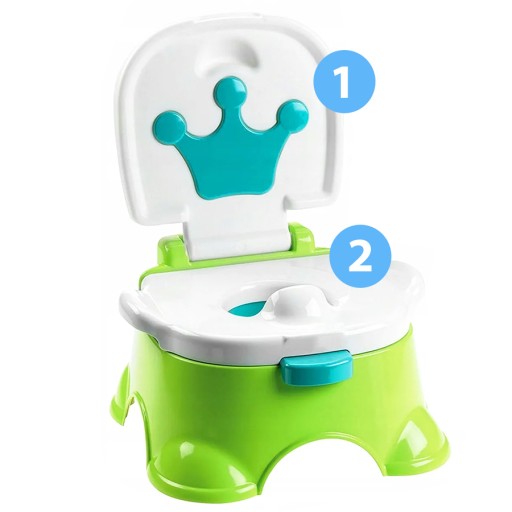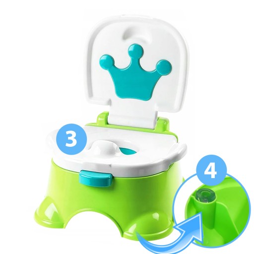 Новітній королівський горщик-трон з корон можна використовувати по-різному - він просто багатофункціональний. Його основною функцією, звичайно, є навчання самостійному користуванню туалетом (1), але з часом його можна використовувати як сидіння (2) і як кришку сидіння (3) завдяки знімному сидінню з горщик. Його наступна роль — просто звичайний стілець вантажопідйомністю до 90 кг (4).