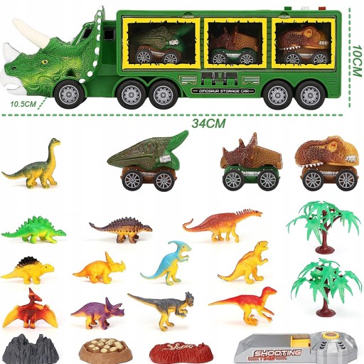 Іграшка-перевізник динозаврів із 23 предметів Наш іграшковий набір динозаврів включає 1 вантажівку динозаврів, 3 висувні машини динозаврів, 12 фігурок динозаврів, 1 круту знімну доріжку та 5 інших аксесуарів.