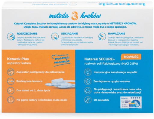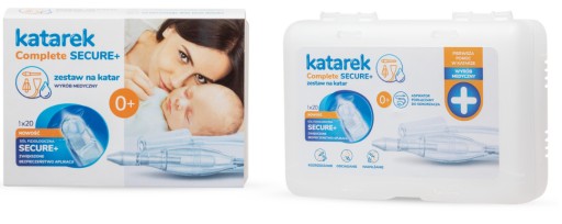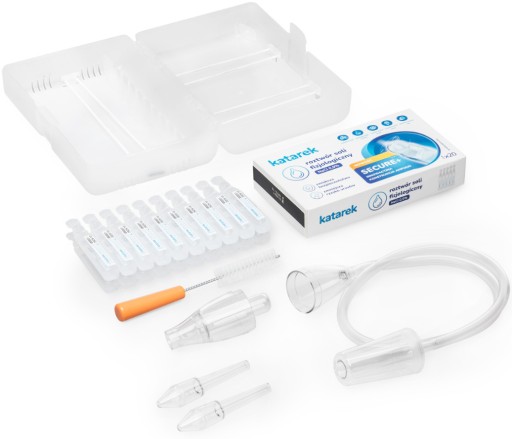Katarek Complete Secure+ — це не лише аспіратор від нежиті, який підключається до пилососа, але завдяки фізіологічному розчину Katarek Secure+ це повний набір для правильної аспірації нежиті у дітей!