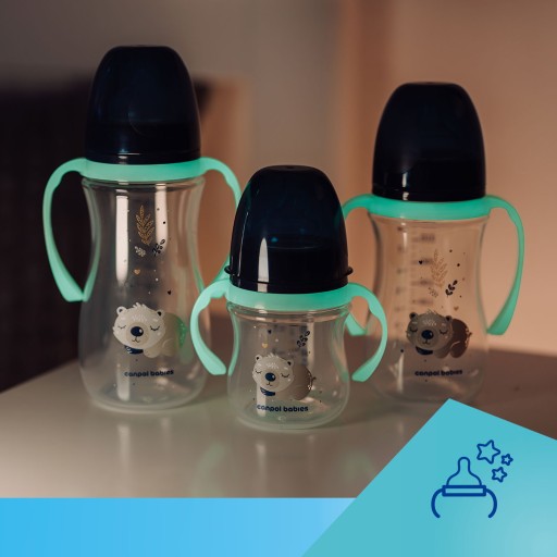 Зручні ручки полегшують утримання маленьких ручок і дозволяють самостійно тримати пляшечку, коли малюк буде готовий.Ручки підсвічують пляшечку в темряві і полегшують пошук пляшечки вночі. Ручки можна зняти. Контурна форма пляшечки полегшує її правильне утримання під час годування.