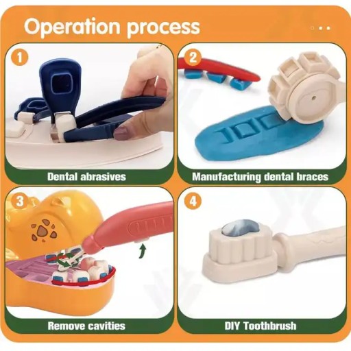 - Розвиток навичок: гра з нашим Playdough Dentist допомагає дітям розвивати ручні навички, творчі здібності та знання про гігієну порожнини рота.