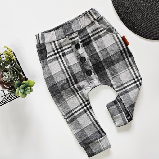 Брюки для хлопчика в чорно-сіру клітку з кишенями і декоративними чорними ґудзиками ідеально виглядають як з елегантною білою сорочкою для створення елегантного урочистого вбрання, так і з чорною блузкою або сірим светром для повсякденних прогулянок.