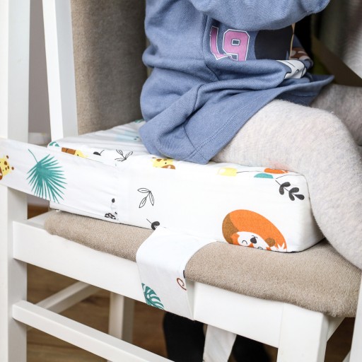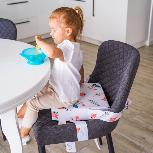 Пропоную дитяче сидіння/бустер, що забезпечує практичну висоту на кріслі. Це добре працює, коли дитина занадто велика для стільчика для годування і все ще занадто мала для стандартного стільця або столу. Сидіння слід прикріпити до стільця за допомогою ременів, вшитих у висоту, щоб воно не рухалося. Наповнювач виготовлений зі стійкого до деформації пінопласту. Матеріал - щільний поліестер, який добре очищається.