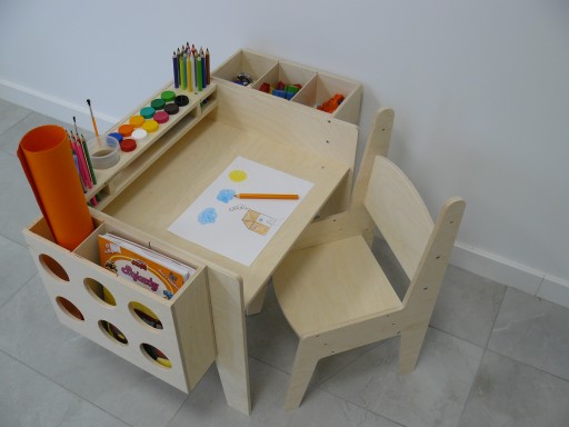Набір складається зі столу, стільця і трьох органайзерів. Виготовлена з фанери, не покрита лаком. І стіл, і стілець мають три рівні регулювання: для немовлят, для малюків і для старших. У набір входять органайзери для фарб, пензлі, чашки для води, кольорові олівці, фломастери та ручки, аркуші паперу та блоки. Завдяки їм вам не доведеться щоразу тягнутися до шухляди чи файлу – все під рукою. Нашими сортерами можна користуватися, поки діти граються – малюють чи малюють. Контейнери стійкі та практичні у використанні, а їх міцна конструкція забезпечує тривале використання. Кожну олівець можна вставити в окремий отвір, тому дитина легко вийме і поставить на місце.Набір чудово доповнить меблі дитячої кімнати, зробивши її інтер'єр теплим і веселим. Меблі функціональні та не займають багато місця. Крісло дуже зручне, а стіл забезпечує достатньо місця для гри. Ваша дитина знайде ідеальне місце для ігор, малювання та малювання та навіть їжі.
