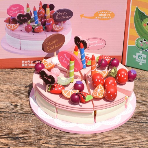 Дерев'яний торт до дня народження з фруктами та столовим посудом. Грайте в їжу, удавано, що ріжете іграшки