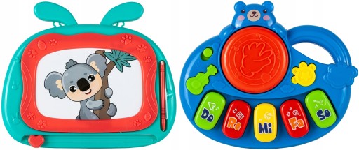 - У набір входять активні іграшки, в тому числі піаніно на батарейках, чарівна дошка для малювання і телефон.