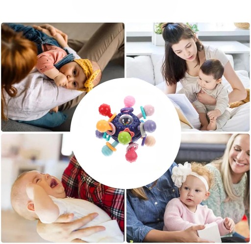 Сенсорний м'яч - багатовимірний м'яч, який буде рости разом з вашою дитиною. М'яч має рухливий силіконовий елемент - кульку - для натискання, витягування, різання і смоктання. Штампи бувають різних текстур і яскравих кольорів, щоб краще стимулювати дітей під час гри.