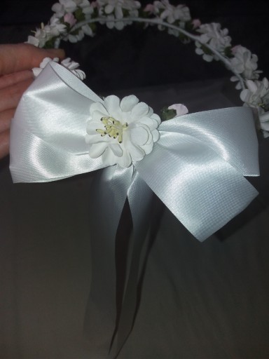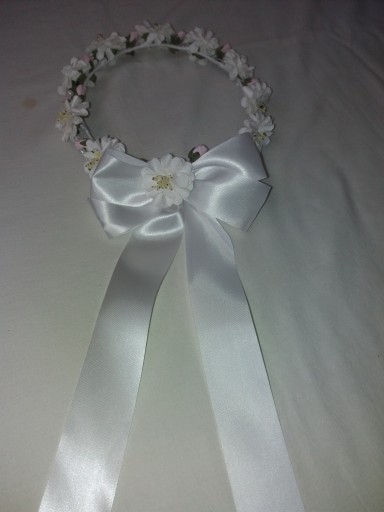 Дуже гарний віночок до Першого Причастя для дівчинки. Білі квіти з рожевими квітами, бантик ззаду.