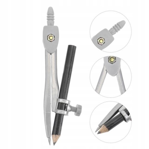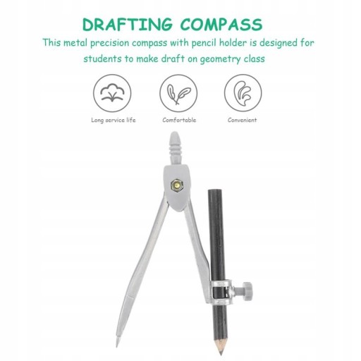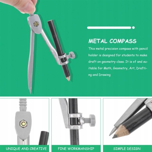 Цей точний металевий циркуль із підставкою для олівців призначений для того, щоб учні малювали на уроках геометрії. Його корпус виготовлений з металу з блискучим покриттям, а підставка для олівців кріпиться за допомогою гвинта. Він підходить і підходить для математики, геометрії, мистецтва, креслення та креслення.