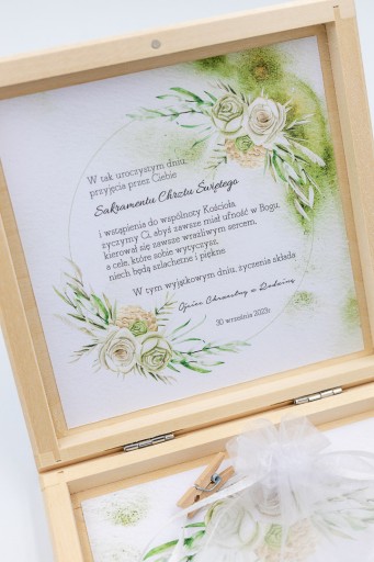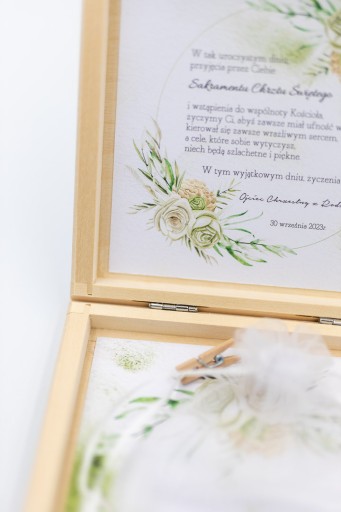 - всередині: угорі: біла листівка з принтом ніжних квітів та персональною присвятою; внизу: біла листівка з принтом ніжних квітів з місцем для розміщення грошей з нагоди Хрещення