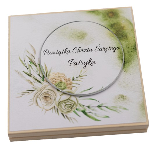- спереду: біла листівка з принтом ніжних квітів, просторово склеєна кругла картка з написом: Пам'ятка Святого Хрещення (ім'я дитини)