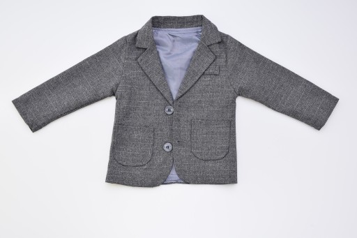 - Жакет застібається на гудзики, дві передні кишені і бутоньєрка. Піджак на підкладці сірого кольору.
