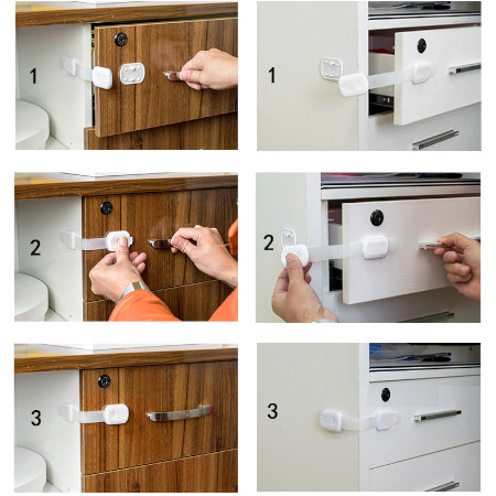 Дуже легко збирається і розбирається - Замок потрібно приклеїти так, щоб одна частина була на дверцятах, а інша на стінці шафи або ящика.