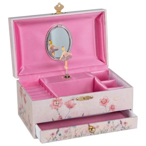 Скринька - ідеальне місце для дрібничок і прикрас. Він вміщає всі дрібниці маленьких леді і стане чудовим місцем, щоб заховати їхні маленькі секрети. Внутрішня частина коробки заповнена ящиками та відділеннями, що полегшує сортування та розподіл вибраних предметів. Виріб також виконує функцію музичної скриньки - інтер'єр прикрашає фігурка балерини, яка в поєднанні з музикою виглядатиме надзвичайно ефектно. Скриньці не потрібні батарейки - щоб почути музику, достатньо завести механізм, розташований на задній частині музичної шкатулки.
