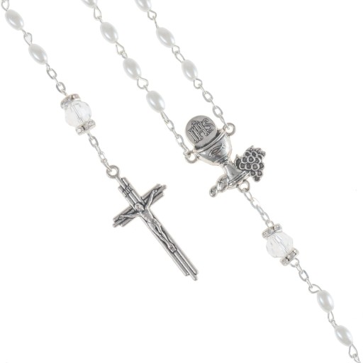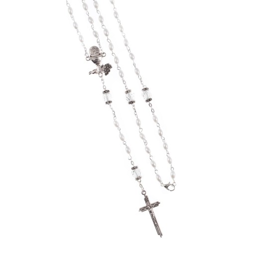 Першопричастяна ранка з овальних намистин, що нагадують перлини, та характерних прозорих скляних намистин у формі кристалів. Всі елементи розміщені на палиці з нержавіючої сталі.