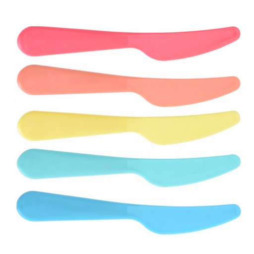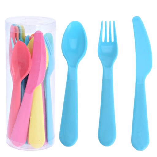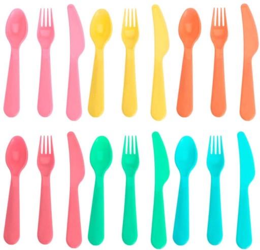 - БАГАТОРАЗОВИЙ - столові прибори з високоякісного матеріалу шести різних кольорів. У набір входять елементи таких кольорів: помаранчевий, червоний, синій, рожевий і бірюзовий. Упаковані в практичний контейнер, що полегшує їх зберігання.