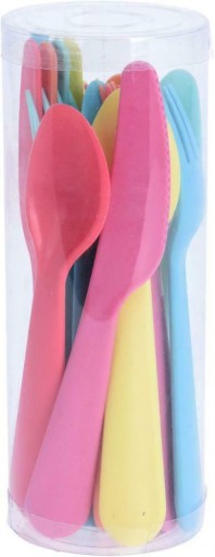 Набір столових приладів, що складається з 18 предметів. Ознайомитися з туристичним мистецтвом можна в саду, під час походів, подорожей чи інших заміських поїздок. Мистецтво також підходить для найменших. Ми з успіхом можемо використовувати їх замість одноразових столових приладів, тому що вони багаторазові. Столові прибори стануть в нагоді під час їжі поза домом, а також коли ми хочемо організувати вечірку, наприклад, день народження для дітей.Виготовлені відповідно до європейських стандартів.