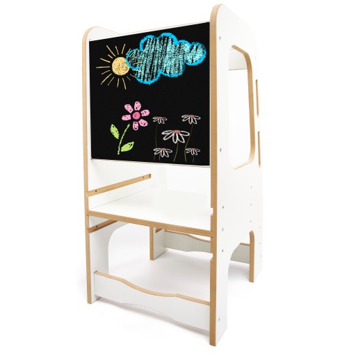 Задня стінка вашого кухонного помічника може використовуватися вашою дитиною як місце для малювання сухостираними фломастерами, або ви можете прикріпити крейдяну дошку, щоб перетворити помічника на шкільну дошку.